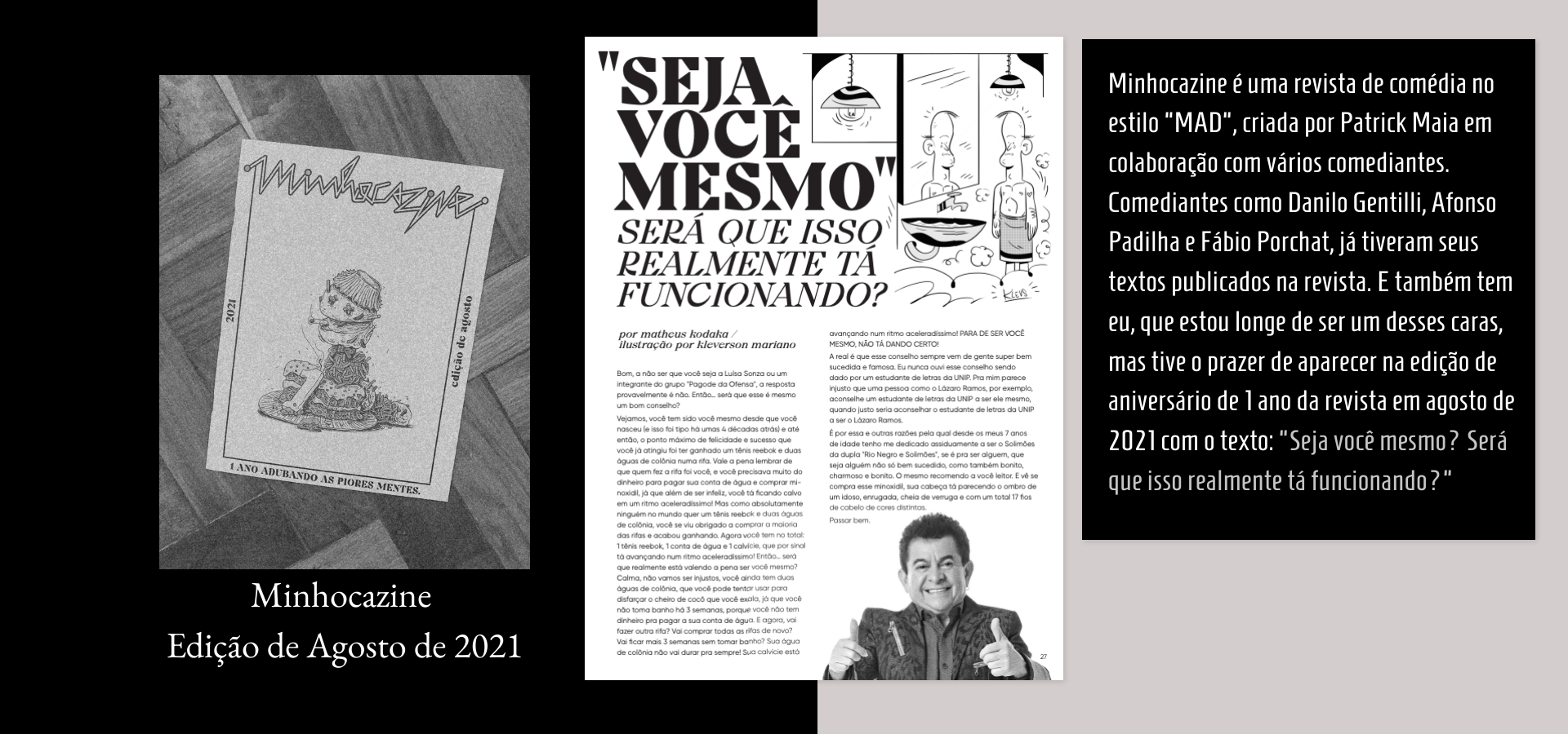 Olá! Meu nome é Matheus Kodaka, tenho 23 anos e atuo como comediante e roteirista de comédia há dois anos. O interesse pela escrita criativa surgiu aos meus 19 anos, através da minha breve jornada no Stand-Up comedy. Comecei a perceber que era de maior prazer o ato de escrever as piadas do que contá-las no palco. Nessa mesma época, pela vontade de atuar como comediante de alguma forma, comecei a produzir esquetes cômicas para o meu canal no youtube, levando muito como inspiração canais de esquete como o "Porta dos Fundos", e também séries de comédia infanto-juvenis ("All That", "Kenan & Kel", Drake & Josh"). Foi então que eu percebi que a minha comédia era melhor expressa através de roteiros, mais especificamente esquetes cômicas e sitcoms, e a partir disso, comecei a estudar e me profissionalizar na área.